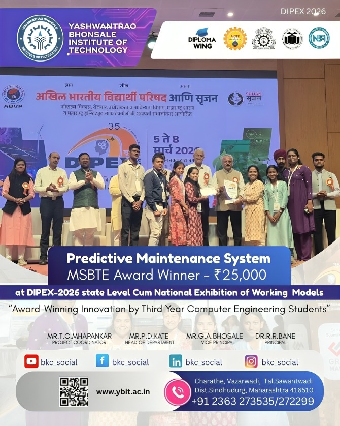 The Third Year Computer Engineering Diploma students of Yashwantrao Bhonsale Institute of Technology, Sawantwadi (Diploma Wing) achieved remarkable success by winning the MSBTE Award of ₹25,000 in the finale of the DIPEX 2026 State Level Cum National Exhibition of Working Models for their innovative project titled “Predictive Maintenance System.” The project was developed by Bhakti Bharat Satam, Bhakti Dattatray Sawant, Sakshi Bharat Sawant, Nandini Sanjeevkumar Singh, and Parnavee Pravin Shirke The Predictive Maintenance System enhances industrial machine safety and reliability by continuously monitoring parameters such as RPM, temperature, sound, voltage, and current through sensors. Using predefined threshold analysis, the system detects abnormal conditions and predicts possible faults before failure occurs. A demo windmill model demonstrates the working principle, while an LCD and dashboard provide real-time data display, fault alerts, and maintenance suggestions, helping reduce downtime and maintenance costs. The exhibition was conducted across several regions, and the grand finale was organized at Chhatrapati Sambhajinagar as a five-day national-level event, where innovative projects from various institutions were presented.