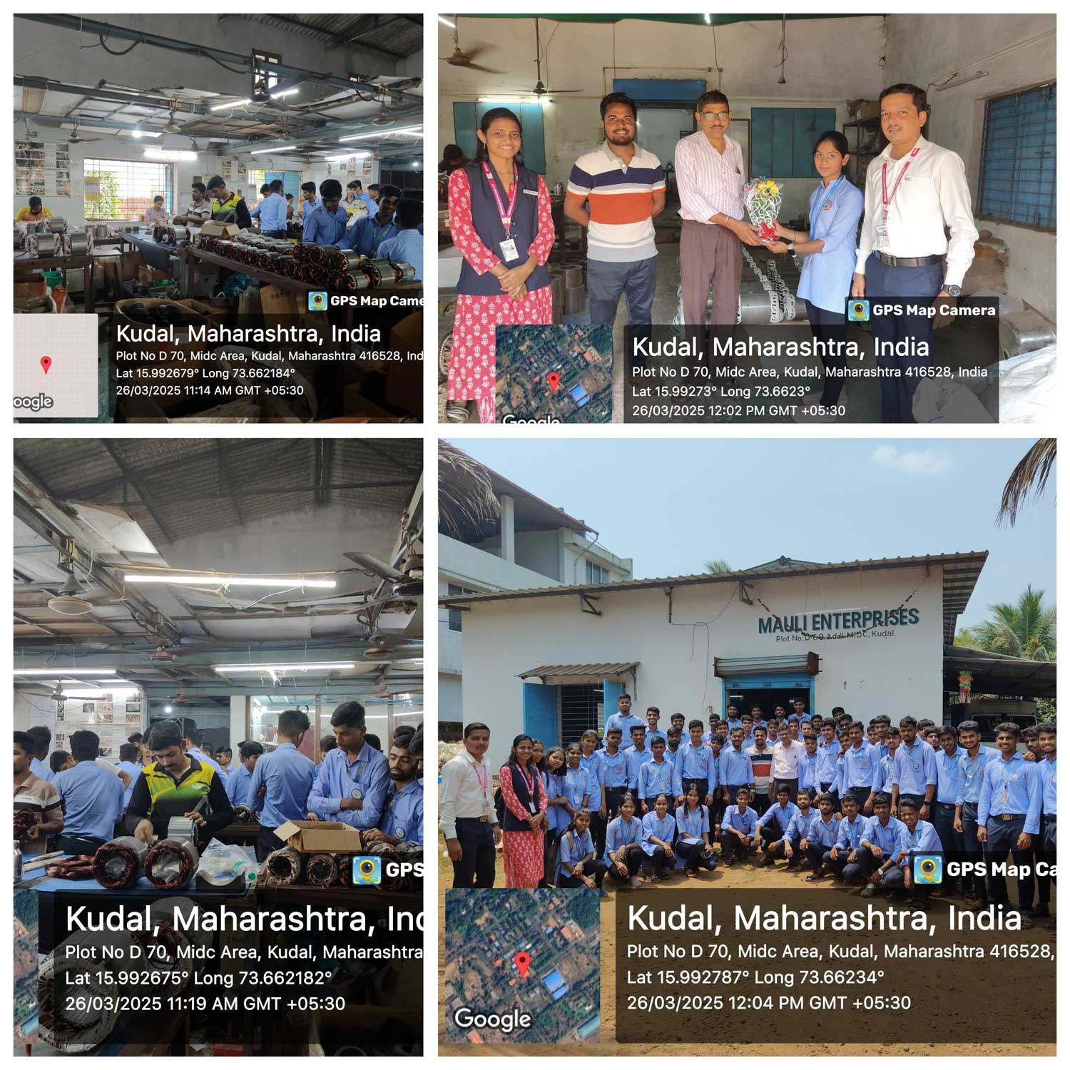 Department of Electrical Engineering organized Industrial Visit for TYEE class to the MAULI ENTERPRISE IN MIDC KUDAL, to gain practical knowledge about motor winding processes, electrical component assembly, and industrial operations. The visit was organized to provide students with hands-on exposure to industrial practices and bridge the gap between theoretical knowledge and practical application. Students were mentored and guided plant in-charge Mr. Wargaonkar Sir along with his supporting staff. Student asked many questions regarding selection criterion of winding wire and numbers of turns. The entire visit is successfully organized by faculty member H.O.D Mr. H.A Pawar sir , Mr. S.S.Ghadigaonkar sir and Ms. T.R.Shenai mam